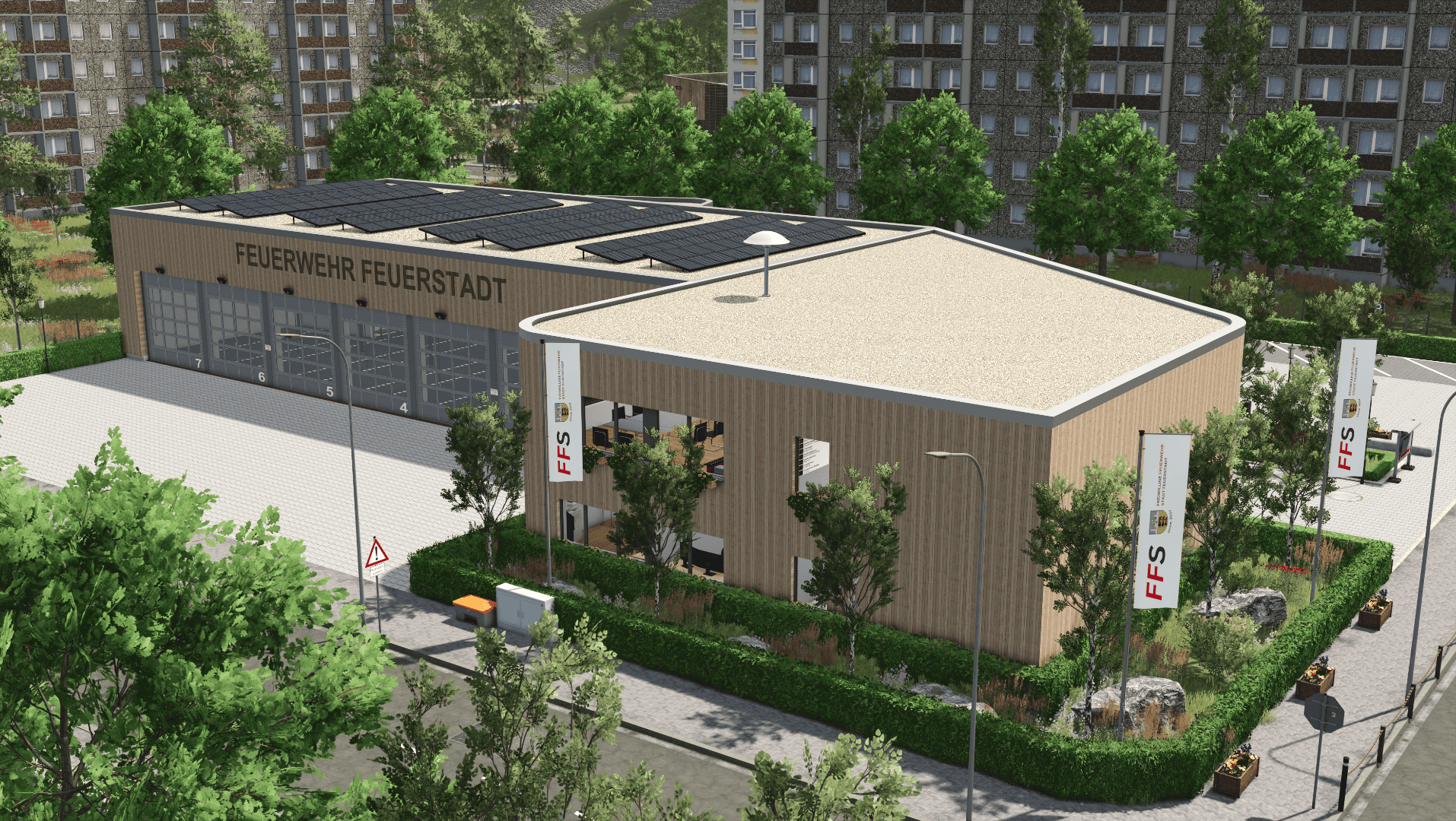 Die Feuerwache der Abteilung 1 befindet sich im Industriegebiet der Kernstadt und wurde so geplant, dass alle Abläufe im täglichen Dienst reibungslos funktionieren.